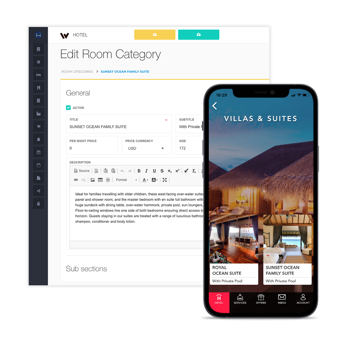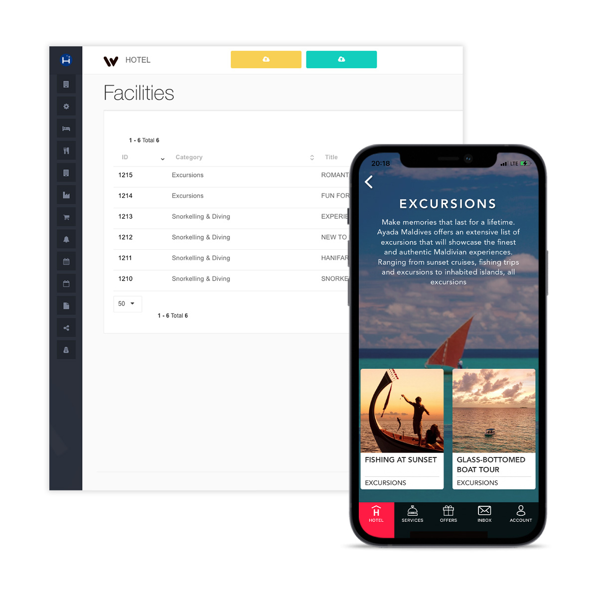 İçerik Yönetim Sistemi, otelinize özel bir mobil uygulama oluşturmanıza fırsat sunar. Her türlü hizmeti ekleyebilir ve öne çıkarabilirsiniz. Misafirleriniz kolayca saniyeler içinde otelinizin sunduğu hizmetler için rezervasyon veya satın alım yapabilirler. Oda içi yemek seçeneklerinden spa rezervasyonlarına kadar sunduğunuz hiçbir hizmetin gözden kaçmadığına emin olun ve gelirlerinizin nasıl arttığına tanıklık edin.
