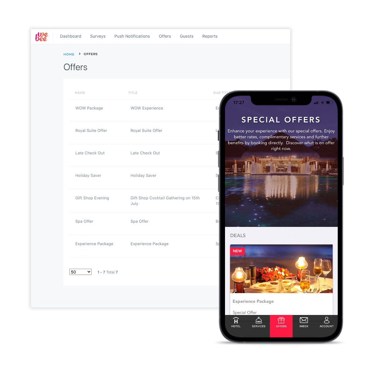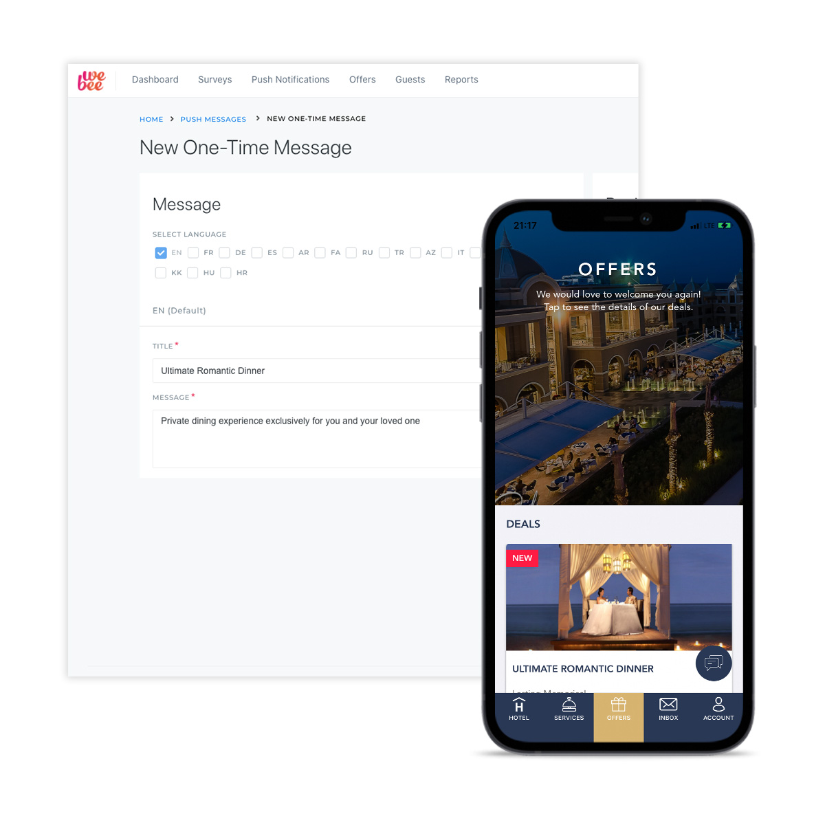 WeBee Misafir Etkileşim Platformu, otelcilere her misafirin davranışlara göre özel tasarlanmış kampanyalar ve teklifler sunma olanağı sağlar. Bu kişiye özel teklifler, WeBee mobil uygulamaları üzerinden anlık bildirim mesajları ile misafirlerinize iletilir.